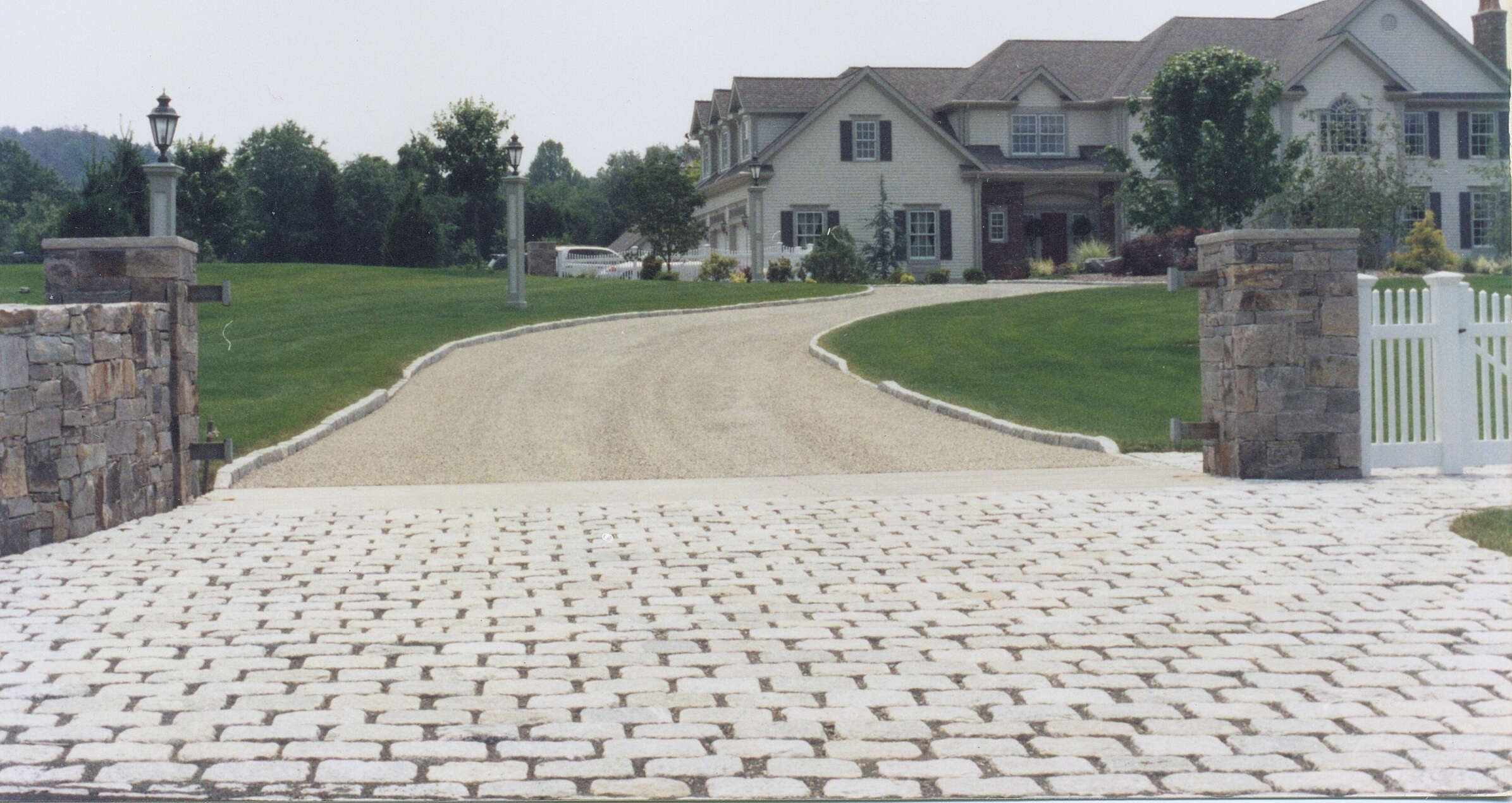 • Cobblestone driveway, granite ashlar pillars, belgium block curbing, brick veneer on house